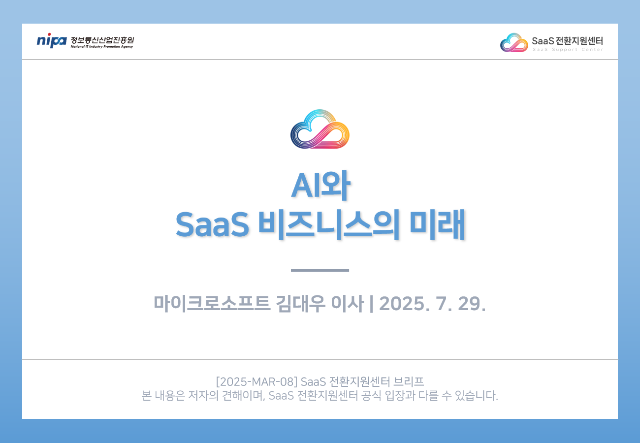 SaaS 전환지원센터의 저작물인 『AI와 SaaS 비즈니스의 미래』은 SaaS 전환지원센터에서 마이크로소프트 김대우 이사에게 집필 자문을 받아 발행한 전문정보 브리프로, SaaS 전환지원센터의 저작권정책에 따라 이용할 수 있습니다.