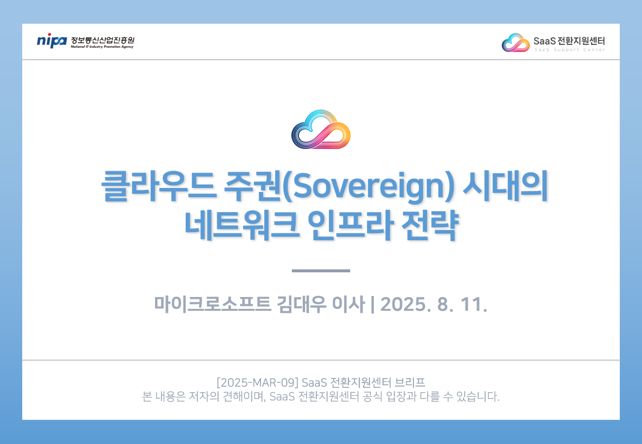 SaaS 전환지원센터의 저작물인 『2025 클라우드 트렌드 : 클라우드 주권(Sovereign) 시대의 네트워크 인프라 전략』은 SaaS 전환지원센터에서 마이크로소프트 김대우 이사에게 집필 자문을 받아 발행한 전문정보 브리프로, SaaS 전환지원센터의 저작권정책에 따라 이용할 수 있습니다.
