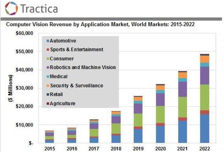 머신 비전의 핵심 기능인 컴퓨터 비전을 좀 더 풀어보려 합니다. 아래의 차트에서 보는 것과 같이 각 산업별로 2022년까지 골고루 성장하고 있으며 특히 리테일(retail), 컨슈머(consumer), 로보틱스(robotics) 및 머신 비전 분야에서 큰 성장세를 보이고 있습니다.