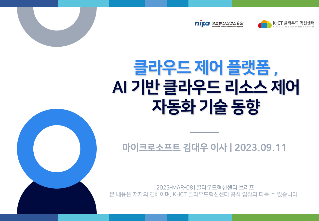 K-ICT 클라우드혁신센터의 저작물인 『클라우드 제어 플랫폼 - AI 기반 클라우드 리소스 제어 자동화 기술 동향』은 K-ICT 클라우드혁신센터에서 마이크로소프트 김대우 이사에게 집필 자문을 받아 발행한 전문정보 브리프로, K-ICT 클라우드혁신센터의 저작권정책에 따라 이용할 수 있습니다.