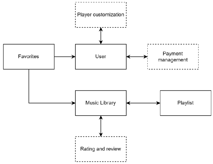 - 플레이어 마이크로서비스: 이 마이크로서비스는 노래 플레이어의 기능을 처리한다. 여기에는 볼륨 조정, 이퀄라이저 옵션, 노래 반복 옵션, 재생 목록 무작위 지정, 노래 순서 변경 등과 같은 사용자 정의 옵션이 포함된다.