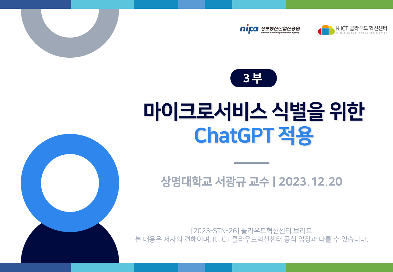 K-ICT 클라우드혁신센터의 저작물인 『마이크로서비스 식별을 위한 ChatGPT 적용』은 K-ICT 클라우드혁신센터에서 상명대학교 서광규 교수에게 집필 자문을 받아 발행한 전문정보 브리프로, K-ICT 클라우드혁신센터의 저작권정책에 따라 이용할 수 있습니다.