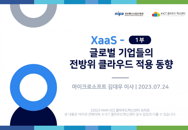 K-ICT 클라우드혁신센터의 저작물인 『XaaS - 글로벌 기업들의 전방위 클라우드 적용 동향』은 K-ICT 클라우드혁신센터에서 마이크로소프트 김대우 이사에게 집필 자문을 받아 발행한 전문정보 브리프로, K-ICT 클라우드혁신센터의 저작권정책에 따라 이용할 수 있습니다.