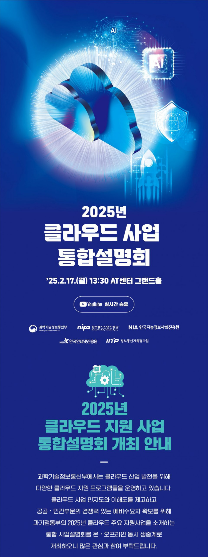 "2025년 클라우드 사업 통합설명회"가 2025년 2월 17일(월) AT센터 5층 그랜드홀에서 개최될 예정입니다.