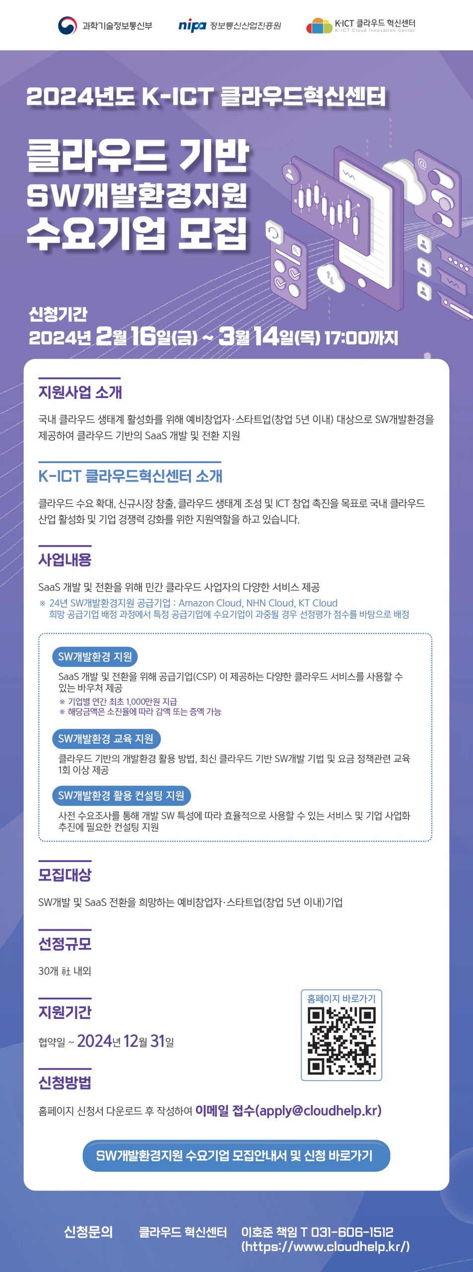 2024년도 클라우드 기반 SW개발환경지원 공급기업 모집공고(~2.28)