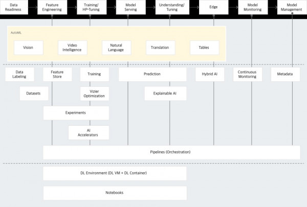 Vertex AI에서 제공하는 MLOps 도구를 사용하면 하나의 UI 또는 API를 통해서 학습에서 배포까지 전체 과정을 자동화할 수 있다. 데이터 통합 기능도 제공해 구글이 정의한 BigQuery ML뿐 아니라 표준 SQL, Spark 등 데이터 처리를 위해 사용되는 도구를 폭넓게 사용할 수 있다.