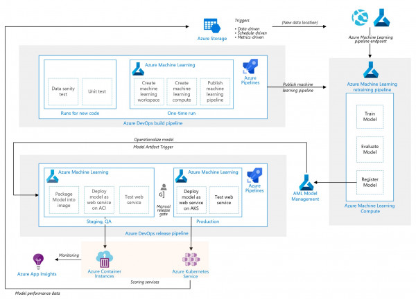 [그림3. Azure Machine Learning과 Azure Pipeline을 결합한 MLOps 아키텍쳐 예제 (출처: https://learn.microsoft.com/)]