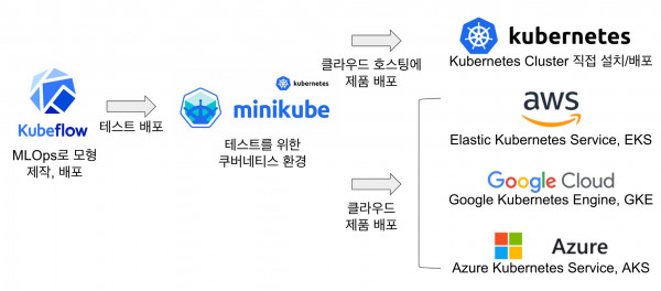 아래 그림은 쿠브플로우에서 시작하는 머신러닝 제품의 클라우드 배포 환경의 예시이다. 쿠브플로우의 배포 대상을 단일 서버 기반의 쿠버네티스 테스트 환경인 미니쿠브(minikube)로 배포하여 제품 배포 전 테스트를 수행한다. 테스트를 성공적으로 통과하면, 클라우드에서 호스팅한 서버 클러스터로 쿠버네티스 클러스터를 최종 배포하거나, 각 클라우드 서비스 공급자들이 제공하는 관리형 쿠버네티스 서비스에 배포할 수 있다.