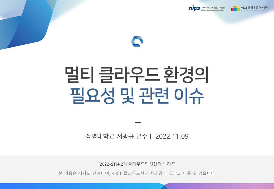 K-ICT 클라우드혁신센터의 저작물인 『멀티 클라우드 환경의 필요성 및 관련 이슈』은 K-ICT 클라우드혁신센터에서 상명대학교 서광규 교수에게 집필 자문을 받아 발행한 전문정보 브리프로, K-ICT 클라우드혁신센터의 저작권정책에 따라 이용할 수 있습니다.