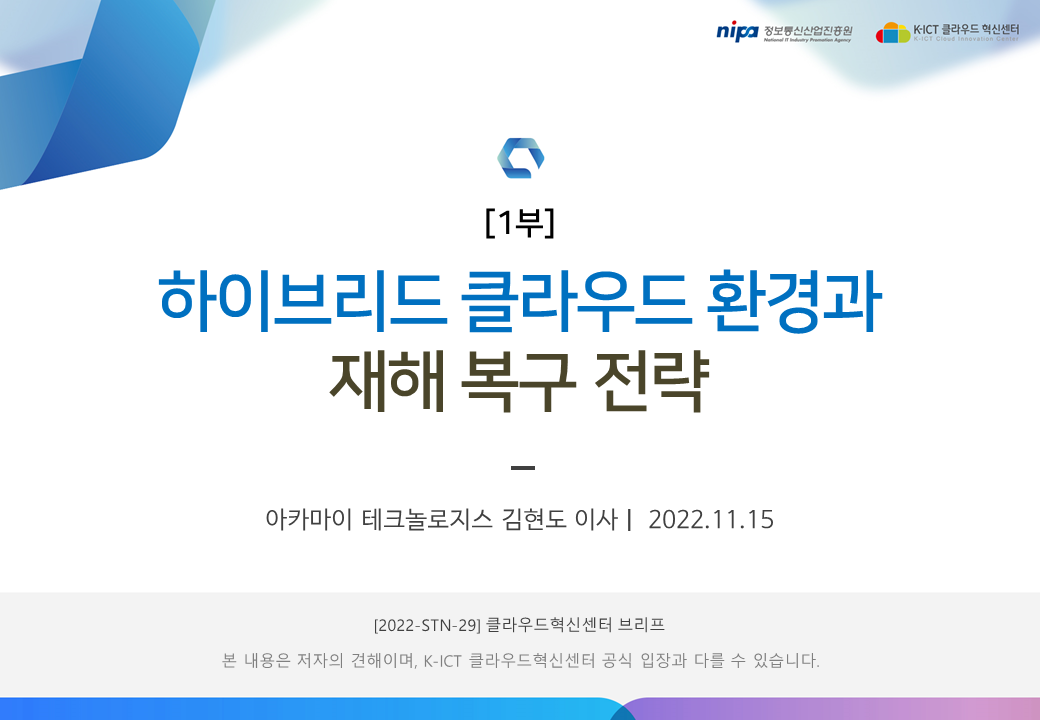 K-ICT 클라우드혁신센터의 저작물인 『하이브리드 클라우드 환경과 재해 복구 전략』은 K-ICT 클라우드혁신센터에서 아카마이 테크놀로지스 김현도 이사에게 집필 자문을 받아 발행한 전문정보 브리프로, K-ICT 클라우드혁신센터의 저작권정책에 따라 이용할 수 있습니다.
