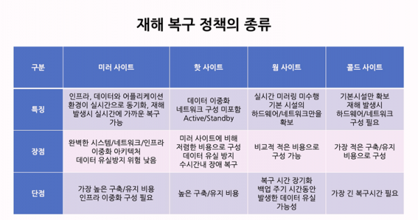 이러한 요소들을 바탕으로 작성되는 재해 복구 정책은 네가지 형태로 구분하여 정의할 수 있다.