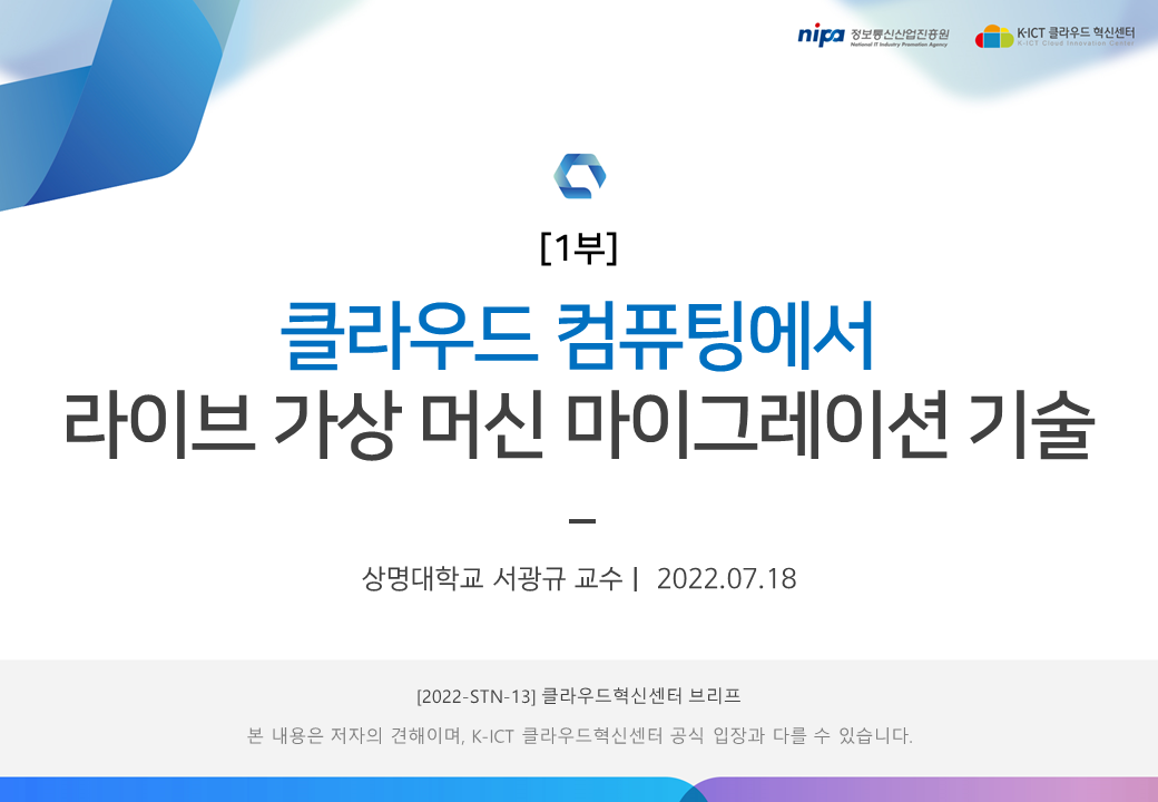 K-ICT 클라우드혁신센터의 저작물인 『[1부] 클라우드 컴퓨팅에서의 라이브 가상 머신 마이그레이션 기술』은 K-ICT 클라우드혁신센터에서 상명대학교 서광규 교수에게 집필 자문을 받아 발행한 전문정보 브리프로, K-ICT 클라우드혁신센터의 저작권정책에 따라 이용할 수 있습니다.