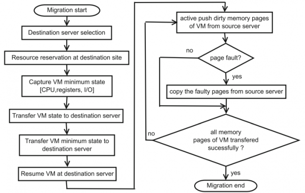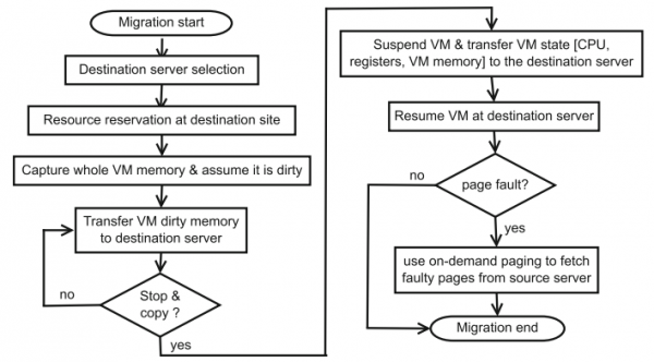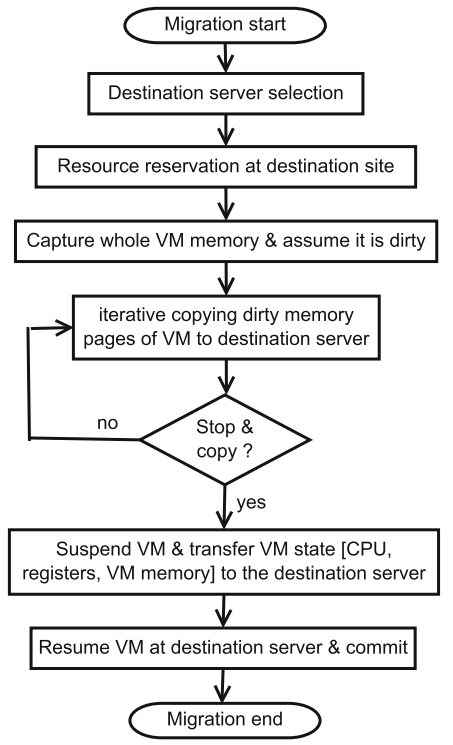사전 복사 기술은 순서도 형식으로 그림 1과 같이 중지 및 복사 단계가 뒤따르는 반복적인 푸시 단계를 사용한다. 반복적인 절차로 인해 더티 페이지라고 하는 일부 메모리 페이지가 업데이트/수정되었으며 마이그레이션 반복 중에 원본 서버에서 재생성된다. 이러한 더티 페이지는 향후 반복에서 대상 호스트로 다시 전송되므로 일부 또는 자주 액세스하는 메모리 페이지가 여러 번 전송된다. 마이그레이션 시간이 오래 걸린다. 첫 번째 단계에서는 VM이 ??소스 호스트에서 계속 실행되는 동안 모든 페이지가 전송된다. 다음 라운드에서 더티 페이지가 다시 전송된다. 두 번째 단계는 정의된 임계값에 따라 달라지는 종료 단계이다. 세 가지 조건 중 하나가 충족되면 종료가 실행된다. 이전 라운드는 정의된 임계값 아래로 떨어진다. 마지막, 중지 및 복사 단계에서 VM 마이그레이션은 소스 서버에서 일시 중단되고 그 후 프로세서 상태와 남아 있는 더티 페이지가 이동한다. VM 마이그레이션 프로세스가 올바른 방식으로 완료되면 하이퍼바이저는 대상 서버에서 마이그레이션 VM을 재개한다. KVM, Xen 및 VMware 하이퍼바이저는 라이브 VM 마이그레이션을 위해 사전 복사 기술을 사용한다.