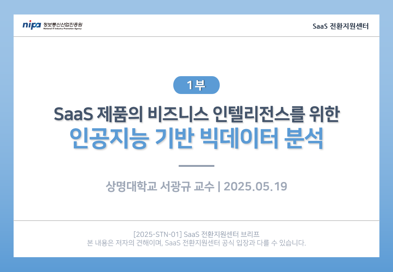 SaaS 전환지원센터의 저작물인 『SaaS 제품의 비즈니스 인텔리전스를 위한 인공지능 기반 빅데이터 분석』은 SaaS 전환지원센터에서 상명대학교 서광규 교수에게 집필 자문을 받아 발행한 전문정보 브리프로, SaaS 전환지원센터의 저작권정책에 따라 이용할 수 있습니다.