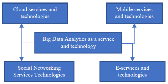 현재 BI는 패러다임을 전환하는 네 가지 기술 기둥, 즉 소셜 기술, 클라우드, 모바일, 빅데이터를 기반으로 구축된다. 이러한 각 기둥은 소셜 네트워킹, 모바일, 클라우드, 빅데이터 서비스라는 고유한 웹 서비스 범주를 나타내며, 이를 종합적으로 결합하여 현대적인 웹 서비스를 구성한다. 분석 기술과 서비스는 이러한 각 서비스를 지원해 왔다. 또한, 그림 2에서 볼 수 있듯이, 빅데이터 분석 기술과 서비스의 도움을 받아 효율적으로 활용할 수 있다.