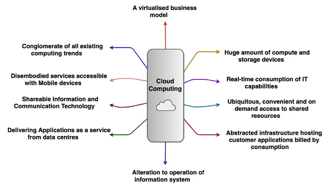 클라우드 컴퓨팅은 하드웨어 및 소프트웨어 리소스를 관리하고 활용하는 방식의 패러다임 전환이다. 클라우드 컴퓨팅 기술을 뒷받침하는 서비스 지향 아키텍처(SOA)의 등장으로 조직은 정보 기술(IT) 인프라의 물리적 및 비물리적 측면을 공유할 수 있다. 아이디어는 컴퓨팅 인프라를 재사용 가능하게 만들어 컴퓨팅 비용을 분산하는 것이다. 이러한 기능은 초기 투자 비용을 크게 줄이고 컴퓨팅 인프라의 운영 비용을 줄인다. 클라우드 컴퓨팅은 사람마다 의미가 다르다. 그림 1는 다양한 연구에서 나온 클라우드 컴퓨팅에 대한 더 요약된 정의를 보여준다. 가장 널리 사용되는 클라우드 컴퓨팅 정의는 미국 국립표준기술원(NIST) 정의와 ISO/IEC 22123- 2의 개념이다.