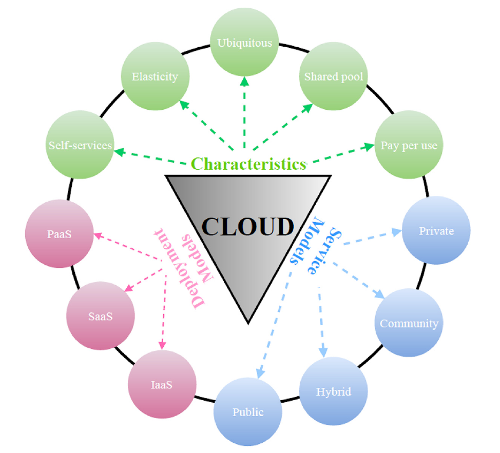 미국 국립표준기술원(NIST) 정의는 클라우드 컴퓨팅은 구성 가능한 컴퓨팅 리소스(예: 네트워크, 서버, 스토리지, 애플리케이션 및 서비스)의 공유 풀에 대한 편리한 주문형 네트워크 액세스를 가능하게 하는 모델로, 최소한의 관리 노력이나 서비스 공급자 상호 작용으로 신속하게 프로비저닝 및 릴리스할 수 있다. 정의는 그림 2에 요약되어 있으며 5가지 필수 특성(주문형 셀프 서비스, 광범위한 네트워크 액세스, 리소스 풀링, 빠른 탄력성 및 측정된 서비스), 3가지 서비스 모델(서비스로서의 소프트웨어, 서비스로서의 플랫폼 및 서비스로서의 인프라) 및 4가지 배포 모델(공용, 사설, 커뮤니티 및 하이브리드)로 구성되어 있다.