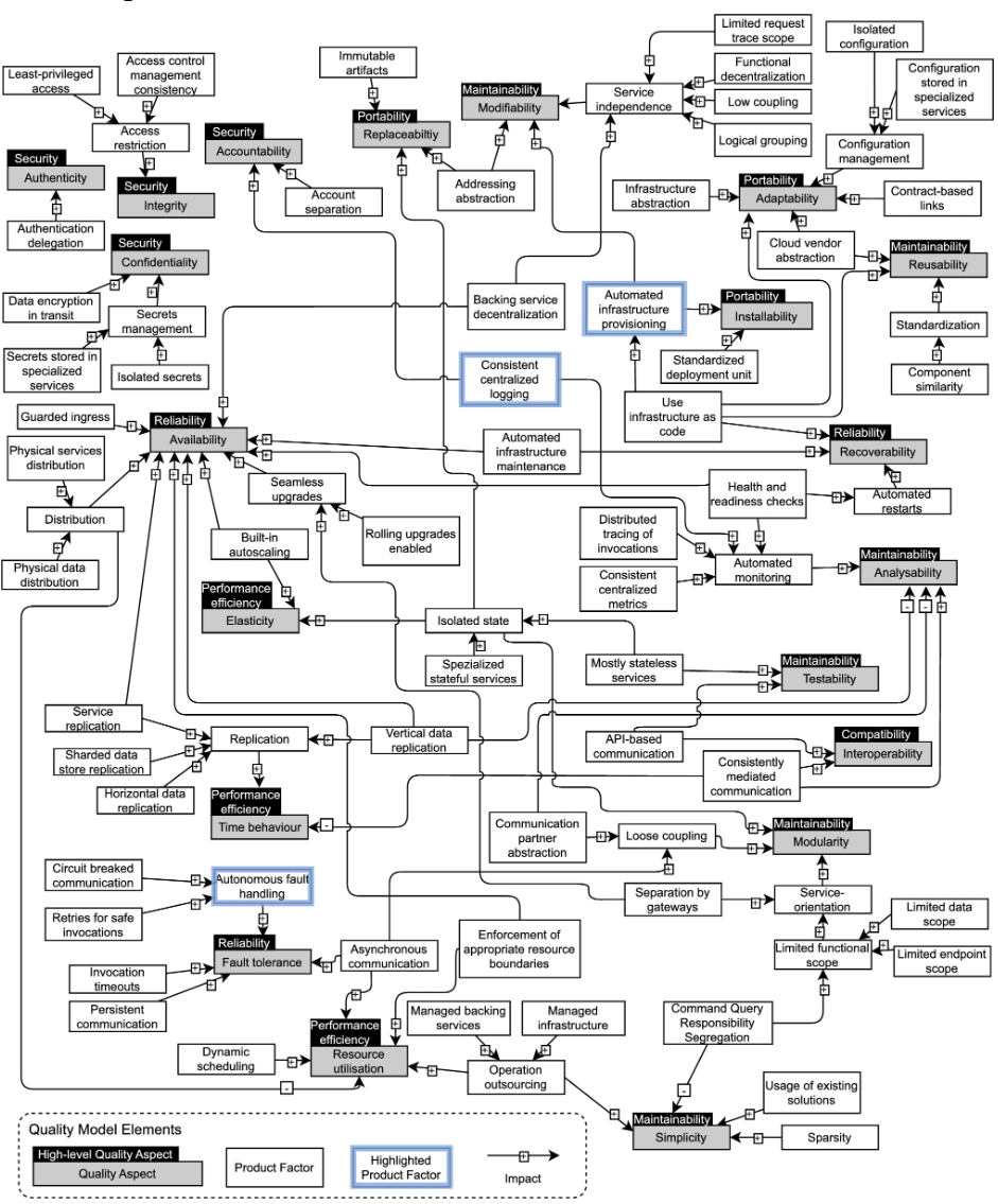 품질 모델에 대한 작업 중에 나타난 흥미로운 측면은 제품 요인과 설계 패턴이 어떻게 관련되어 있는가 하는 것이다. 많은 실무자 서적은 클라우드 네이티브를 달성하기 위한 패턴을 제시하고 과학 문헌에서도 아키텍처의 품질 평가는 종종 패턴을 기반으로 한다. 제품 요인과 패턴은 매우 상호 관련되어 있으며 어떤 경우에는 제품 요인이 패턴에 직접 매핑된다. 그러나 이상적으로는 패턴이 아키텍처 내의 특정 엔티티 형성과 해당 속성에 반영된다. 아키텍처를 평가할 때 특정 패턴이 사용되었다는 사실은 관련 제품 요인을 측정하는 해당 아키텍처 측정을 통해 측정할 수 있어야 한다. 따라서 이 제품 요인이 영향을 미치는 품질 측면은 원래 패턴이 목표로 삼은 품질 측면과 동일해야 하며, 본질적으로 특정 패턴을 사용하면 특정 품질 측면에 영향을 미치는 것과 동일한 결과가 나와야 한다.