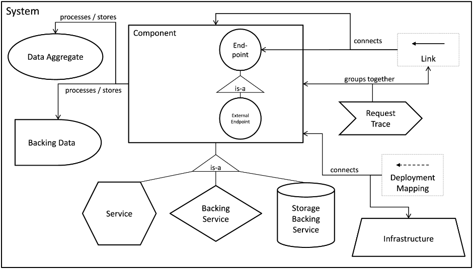 따라서 소프트웨어 아키텍처 모델에 의존하기로 결정하고 이러한 모델의 잠재적 엔터티를 공식화하는 것이 필요하다. 또한 기존 접근 방식 적용을 위해 클라우드 네이티브 애플리케이션의 소프트웨어 아키텍처에 대해 현재 사용 가능한 모델링 옵션을 검토도 필요한데 그 결과가 그림 3에 표시된 엔티티이다.