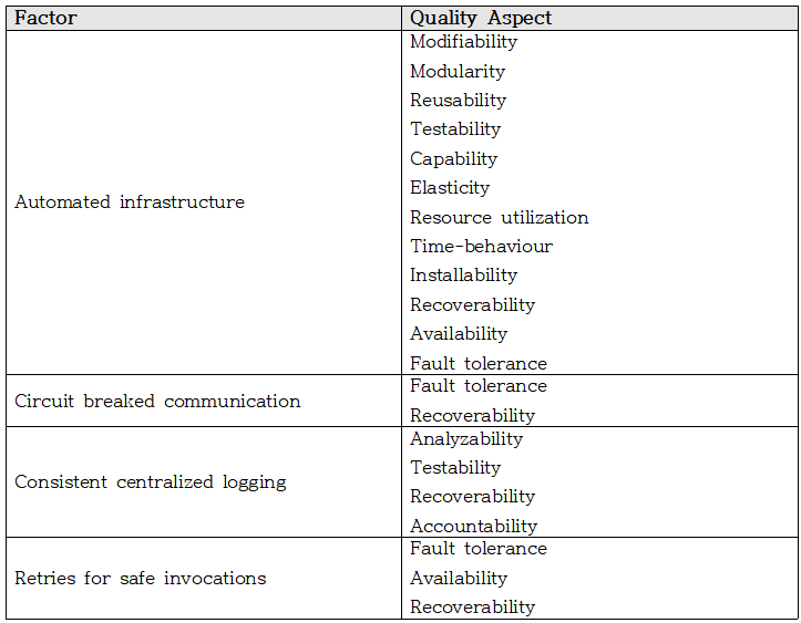 따라서 요인을 세분화하여 해당 품질 측면에 영향을 미치는 자동화된 인프라 프로비저닝과 자동화된 인프라 유지 관리라는 두 가지 별도 요인으로 분할이 가능하다. 일반적으로 자동화된 인프라 프로비저닝의 수정 가능성에 대한 긍정적 영향을 유지하는데 그 이유는 설문 조사 결과를 품질 모델을 세분화하는 기준으로 사용했기 때문이지 확실한 결과로 사용하지 않았기 때문이다.
