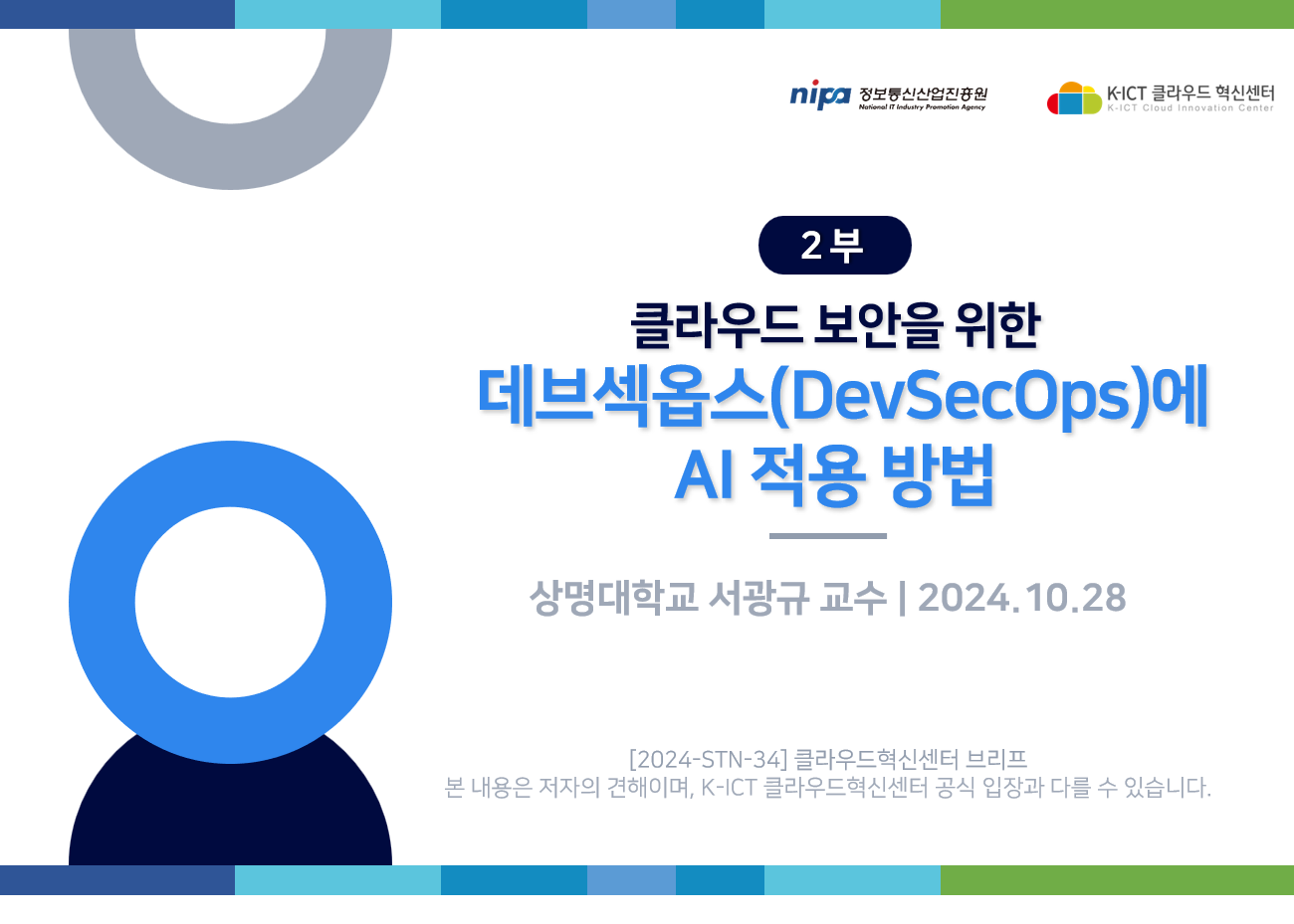 K-ICT 클라우드혁신센터의 저작물인 『클라우드 보안을 위한 데브섹옵스(DevSecOps)에 AI 적용 방법』은 K-ICT 클라우드혁신센터에서 상명대학교 서광규 교수에게 집필 자문을 받아 발행한 전문정보 브리프로, K-ICT 클라우드혁신센터의 저작권정책에 따라 이용할 수 있습니다.
