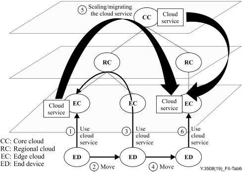 예를 들어, 아래 그림은 최종 장치가 서로 다른 유형의 액세스로 이동하는 동안 이동성의 두 가지 방법을 보여준다. 한 가지 방법은 아래 그림의 3단계에 표시된 것처럼 지역 클라우드가 패킷을 이전 에지 클라우드로 라우팅하는 것이다. (클라우드 서비스를 현재 에지 클라우드로 라우팅하는 것도 가능하다.) 또 다른 방법은 코어 클라우드가 빠르고 안정적인 네트워크로 클라우드 서비스를 확장하거나 마이그레이션하여 클라우드 서비스를 엔드 디바이스 근처의 에지 클라우드로 라우팅하는 것이다. 5단계와 6단계에 표시된 대로 연결한다. 클라우드 서비스는 이전 에지 클라우드 또는 코어 클라우드에서 제공된다. 따라서 분산 클라우드에서 높은 이동성을 효율적으로 지원하기 위해 클라우드 서비스에 대한 서비스 수준 계약(SLA)을 기반으로 두 가지 방법을 모두 선택한다. SLA에는 대기 시간, 서비스 품질 등이 포함된다.