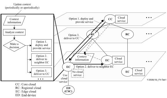 참고 - 결정의 예: 1) 클라우드 서비스 배포 및 EC에 클라우드 서비스 제공, 2) 이웃 EC에 요청 전달, 3) CC에 요청 전달 등