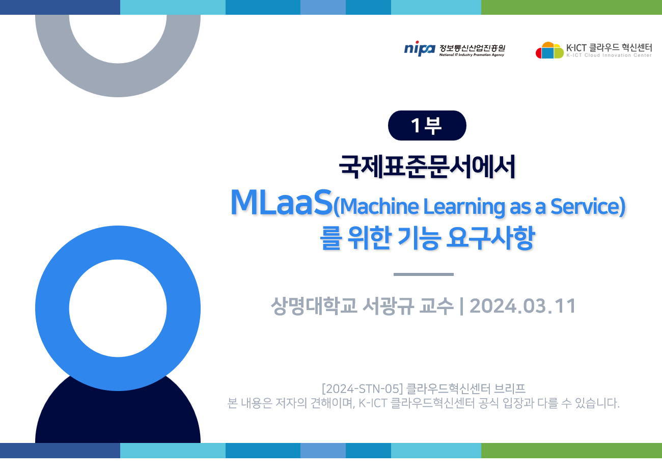 K-ICT 클라우드혁신센터의 저작물인 『국제표준문서에서 MLaaS(Machine Learning as a Service)를 위한 기능 요구사항』은 K-ICT 클라우드혁신센터에서 상명대학교 서광규 교수에게 집필 자문을 받아 발행한 전문정보 브리프로, K-ICT 클라우드혁신센터의 저작권정책에 따라 이용할 수 있습니다.
