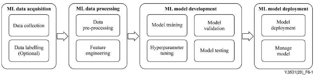 머신러닝 프로세스는 ML 데이터 수집, ML 데이터 처리, ML 모델 개발 및 ML 모델 배포를 통해 구현된다. 그림 1은 ML의 일반적인 프로세스를 보여준다.