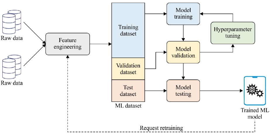 그림 2에서 ML 프로세스의 최종 출력은 장치에서 작업을 수행할 수 있는 능력을 갖춘 훈련된 ML 모델이다. 배포된 훈련된 ML 모델이 허용 가능한 성능 이하로 떨어지면 모델을 다시 훈련하거나 리엔지니어링해야 한다. 배포된 모델은 특정 목적에 필요한 성능을 충족하기 위해 새로운 데이터 세트를 사용하여 재학습된다.