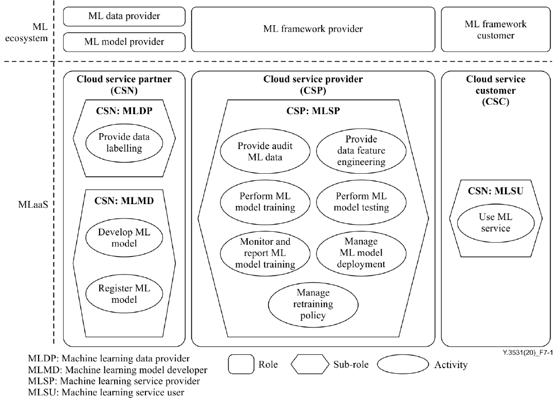 클라우드 컴퓨팅 하위 역할은 표 1에 표시된 대로 ML 역할에 매핑될 수 있다. CSP(클라우드 서비스 공급자), CSN(클라우드 서비스 파트너) 및 CSC의 하위 역할은 ML 생태계의 역할 및 하위 역할에 매핑된다.