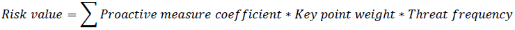 예를 들어, 사용자 데이터는 매우 중요하므로 가중치는 3이다. CSP가 사용자 데이터의 빈번한 도난을 당할 경우 위협 빈도는 3이다. CSP가 이 위협에 대한 보호 조치가 없는 경우 사전 조치 계수는 1이다. 위 공식에 따르면 현재 위험 값은 9이다.