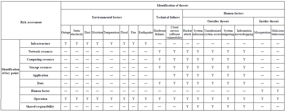표의 행과 열이 교차하여 형성된 셀의 문자 'Y'는 클라우드 서비스에 대한 특정 위협이 클라우드 컴퓨팅 환경에서 위험 관리를 위한 해당 핵심 지점에 의해 해결됨을 나타낸다.