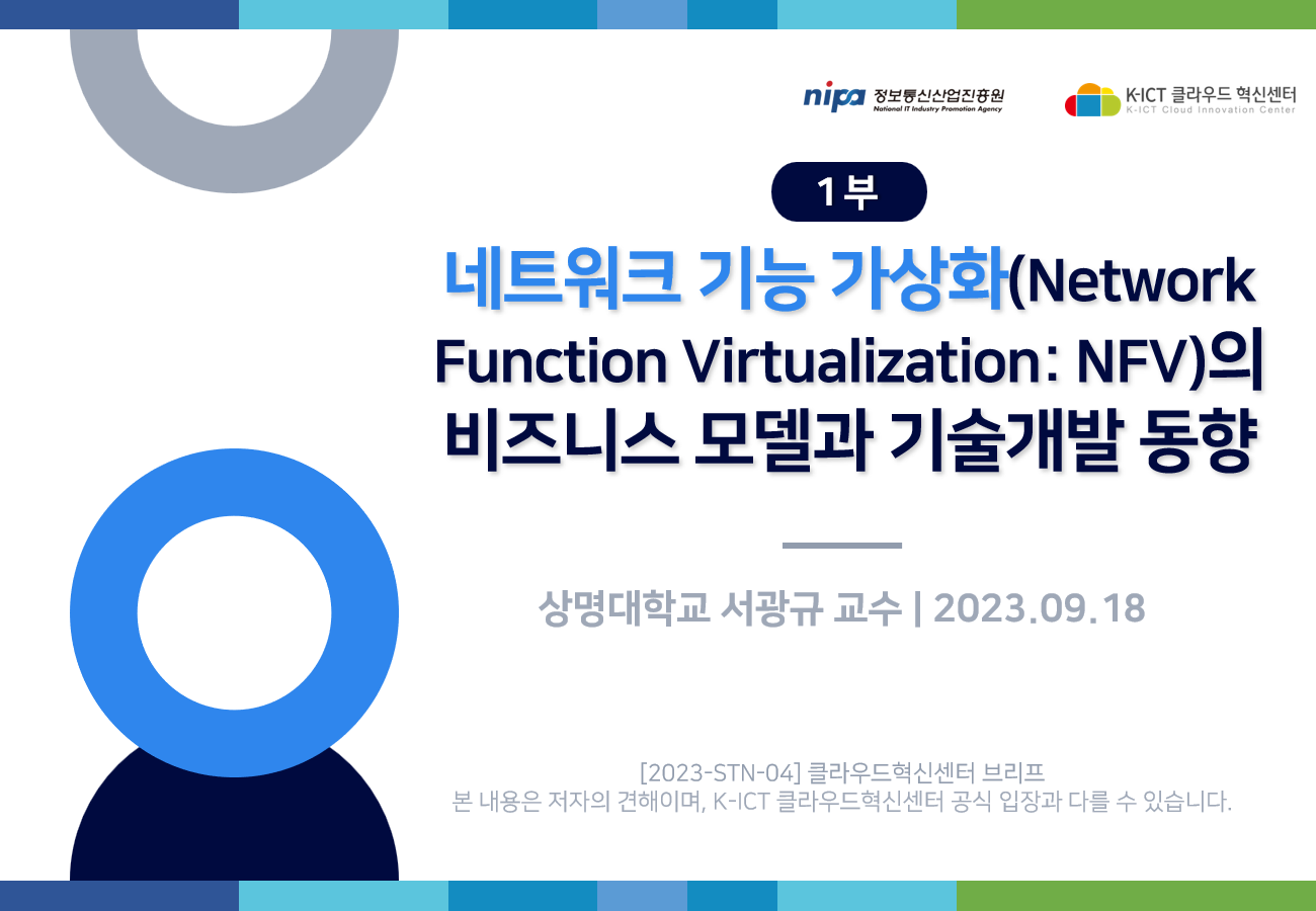 K-ICT 클라우드혁신센터의 저작물인 『네트워크 기능 가상화(Network Function Virtualization: NFV)의 비즈니스 모델과 기술개발 동향』은 K-ICT 클라우드혁신센터에서 상명대학교 서광규 교수에게 집필 자문을 받아 발행한 전문정보 브리프로, K-ICT 클라우드혁신센터의 저작권정책에 따라 이용할 수 있습니다.