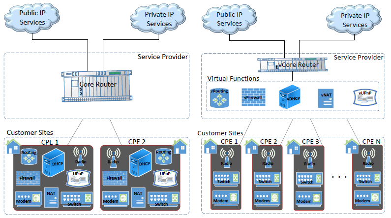 [그림1. 기존 고객 구내 장비(Customer Premises Equipment; CPE) 구현 vs. NFV로 가능한 CPE 구현]