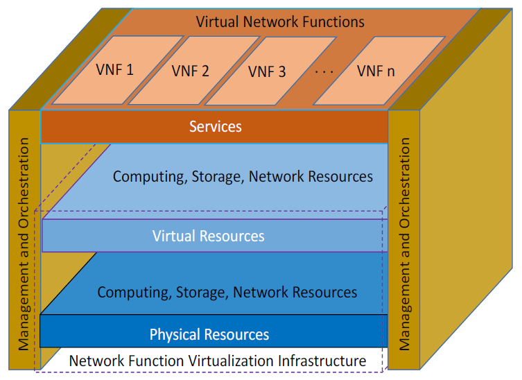 ETSI에 따르면 NFV 아키텍처는 NFVI(네트워크 기능 가상화 인프라), VNF 및 NFV MANO의 세 가지 핵심 요소로 구성된다.