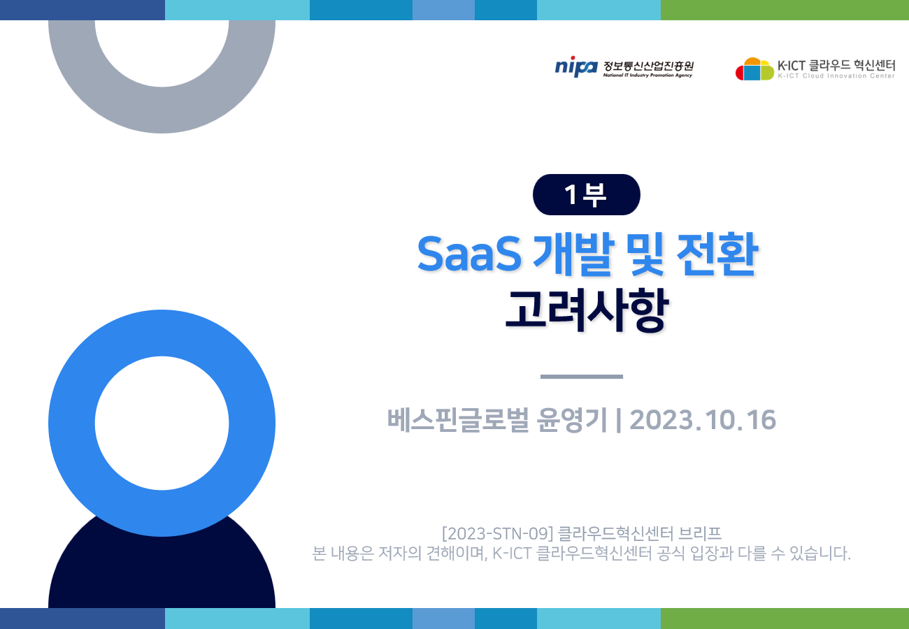 K-ICT 클라우드혁신센터의 저작물인 『SaaS 개발 및 전환 고려사항』은 K-ICT 클라우드혁신센터에서 베스핀글로벌 윤영기님에게 집필 자문을 받아 발행한 전문정보 브리프로, K-ICT 클라우드혁신센터의 저작권정책에 따라 이용할 수 있습니다.