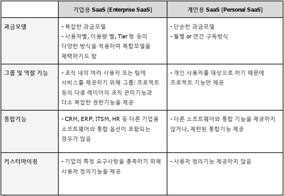 기업용 SaaS(Enterprise SaaS)와 개인용 SaaS(Personal SaaS)는 다음과 같은 특징을 갖는것이 일반적이다.
