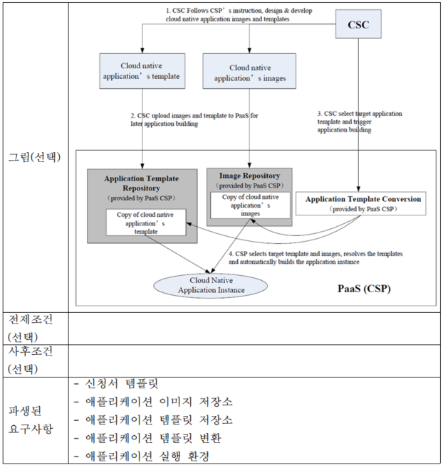 PaaS CSP는 CSC에 의한 애플리케이션 템플릿 업로드, 저장, 업데이트, 삭제를 지원하기 위해 애플리케이션 템플릿 저장소를 제공하는 것이 좋다.
