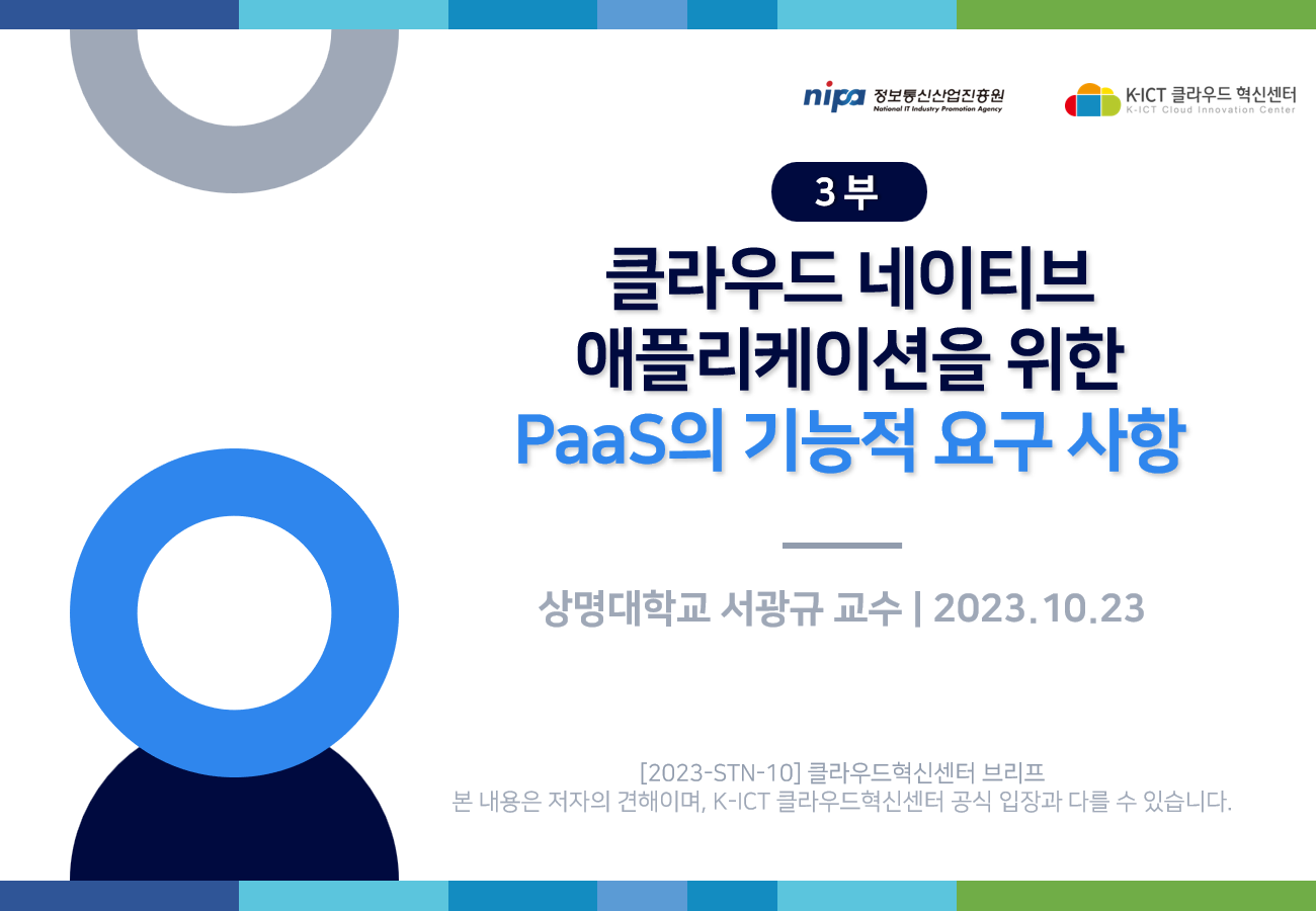 K-ICT 클라우드혁신센터의 저작물인 『국제표준문서에서 클라우드 네이티브 애플리케이션을 위한 PaaS(Platform as a Service)의 기능적 요구 사항』은 K-ICT 클라우드혁신센터에서 상명대학교 서광규 교수에게 집필 자문을 받아 발행한 전문정보 브리프로, K-ICT 클라우드혁신센터의 저작권정책에 따라 이용할 수 있습니다.